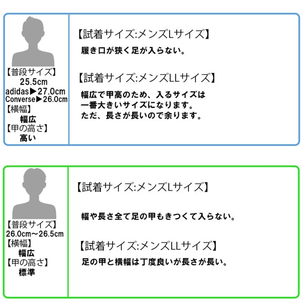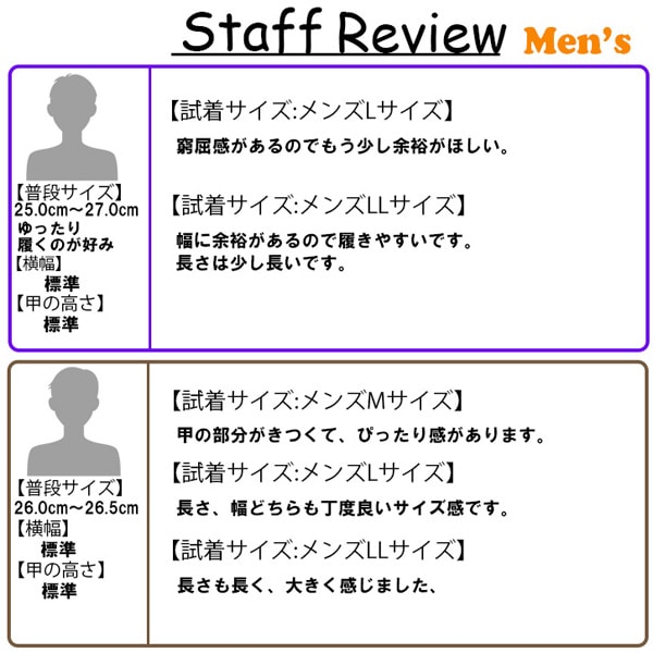 ゆったりと履きたい方、幅広、甲が高い方は普段履いているサイズよりワンサイズ大きめをおすすめいたします。